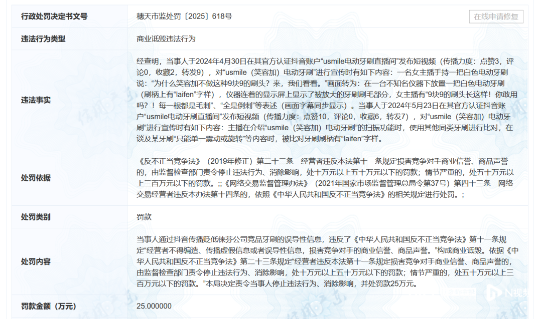 科罚信息涌现,经查明,广州星际悦动股份有限公司于2024年4月30日、2024年5月23日均在短视频平台官方账户“usmile电动牙刷直播间”发布短视频,被认定组成生意乱骂。